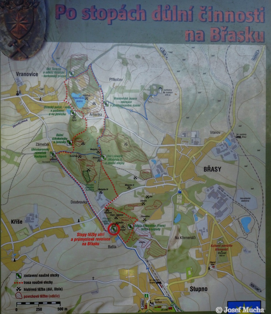 Bašta u Břas – profil černouhelnou pánví - informační tabule s mapou břaské pánve s povrchovými a hlubinnými doly Fotogalerie: PP Bašta - Břasy